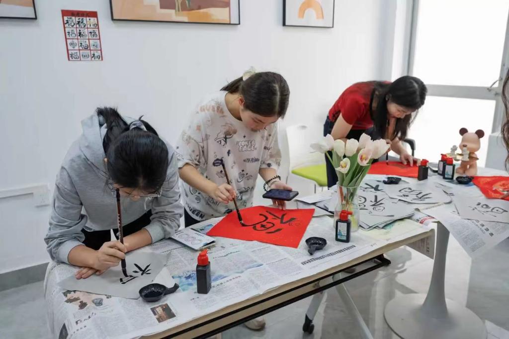 活动现场洋溢着热烈温馨的节日气息,同学们沉浸式感受传统节气的独特魅力。在漆扇绘制环节,大家充分发挥巧思创意,将冬至习俗、团圆意象等元素融入扇面创作,一把把色彩斑斓的漆扇承载着对节日的美好期许;灯谜竞猜区人头攒动,同学们围绕民俗知识、节气文化等主题灯谜展开思考,猜对谜底后的欢呼与集章的喜悦,让互动乐趣持续升温;福字书写环节中,同学们手握毛笔,在纸上挥毫泼墨,笔墨间香气氤氲,字里行间饱含对新年的祝福,现场暖意融融。
