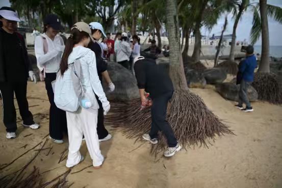 清洁小组的志愿者们沿海岸线开展净滩作业,赵辉、翁江峰与志愿者们一同行动,手持工具、分工协作,沿沙滩逐段清理烟蒂、塑料瓶等垃圾。朱永安、杨炳兴全程参与劳动,一边清理垃圾,一边与师生交流,分享多年从事环保工作的经历与感悟。志愿者们将清理后的垃圾严格分类装袋,并运送至附近垃圾站点,整个过程井然有序。不少市民和游客驻足观看,部分人还主动加入净滩队伍。同学们的行动也赢得了周边商户的点赞,有店主特意送来矿泉水表达谢意。